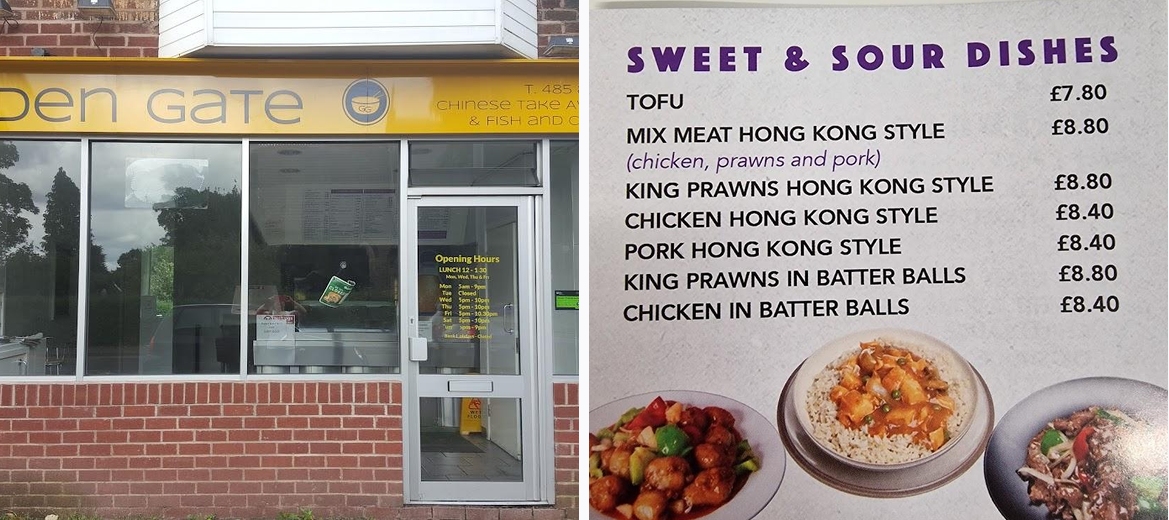 The Golden Gate specializes in fish and chips along with a wide selection of Chinese meals. The menu includes everything from crispy noodles to sweet and sour dishes, making it a varied dining option.